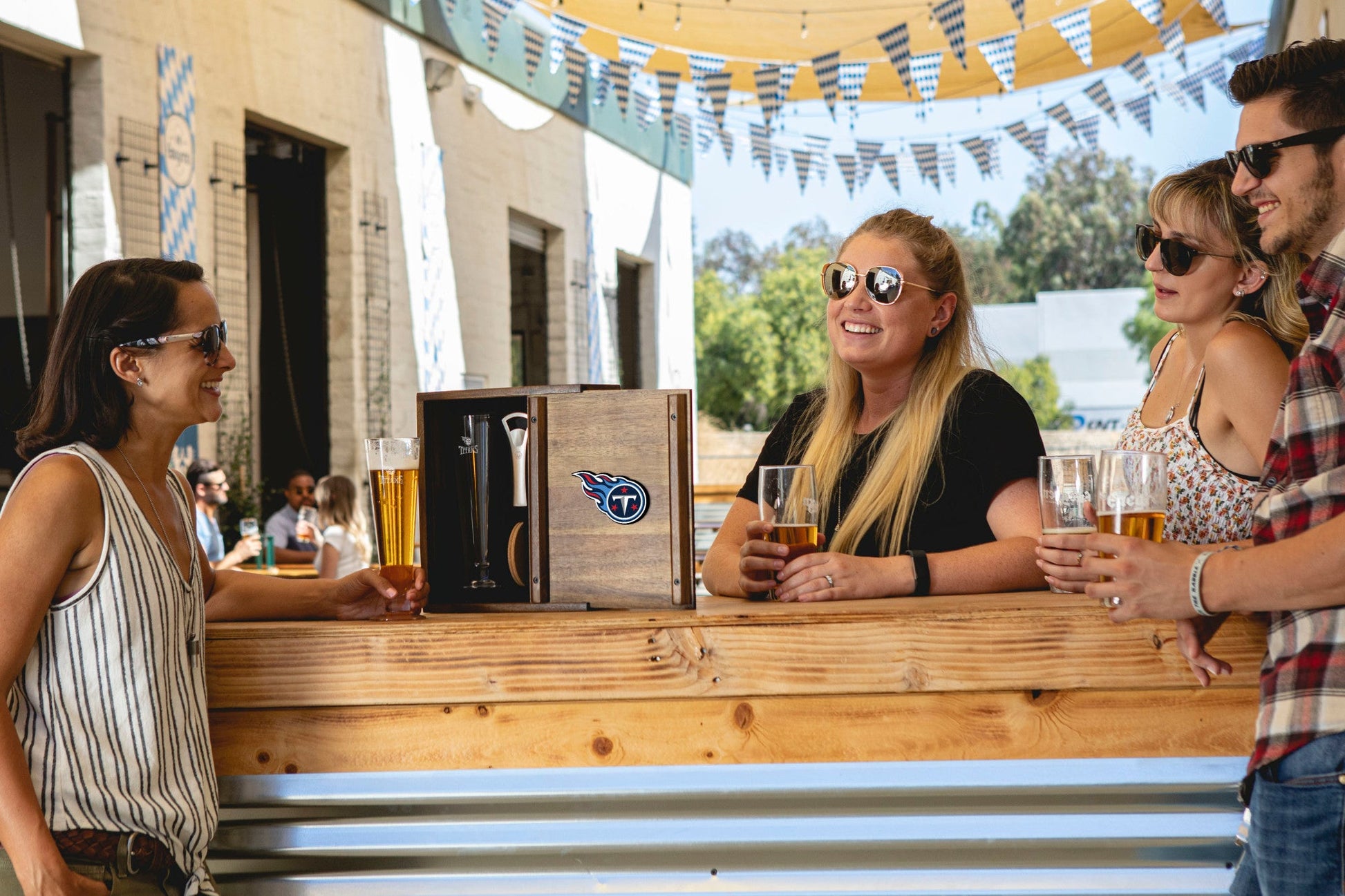 The handsome acacia wood and dovetail joinery of the Tennessee Titans Pilsner Beer Glass Gift Set with 2 Beer Glasses can stand alone on your bartop as an objet d'art - but under the sliding, removable panel is the real treat for beer lovers: two tall 12 oz fluted beer glasses, two real cork beverage coasters, and a deluxe bottle opener. This beer glass set brings back the ceremony of serving drinks and is a worthy craft beer gift for the discerning beer lover in your life. At home or on the go, give your favorite craft beers the elevated treatment they deserve with this deluxe beer drinker gift set.